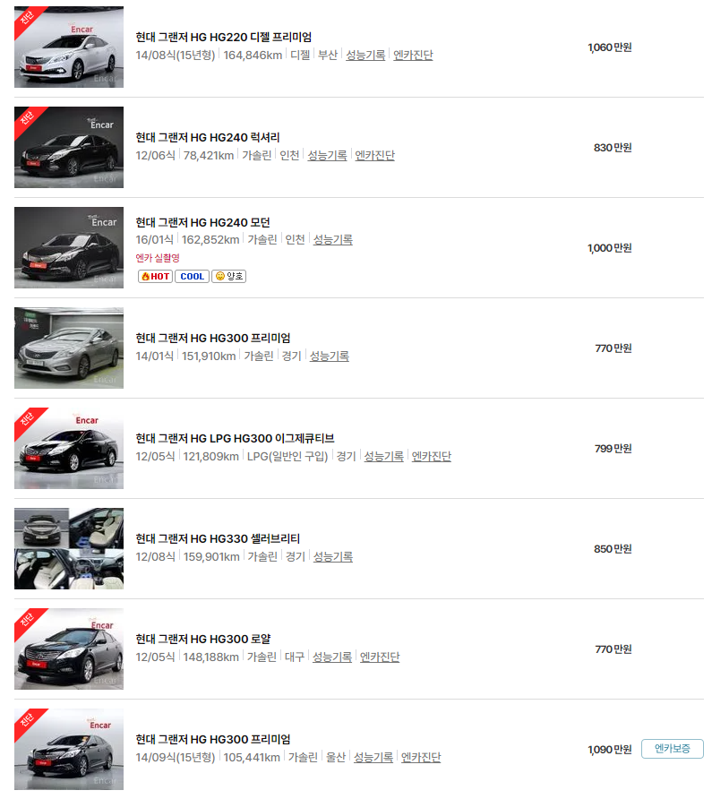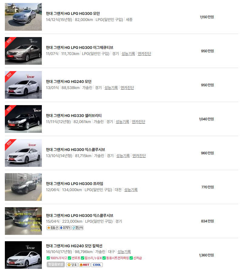 HG 모델은 트림별로도 가격 차이가 크며, 연식이 오래될수록 더 저렴한 가격에 만나볼 수 있습니다. 연식별 옵션과 유지비용까지 함께 비교해보면 더 합리적인 선택이 가능합니다.