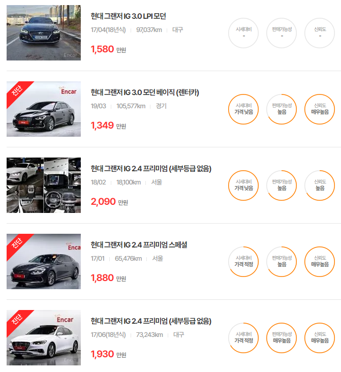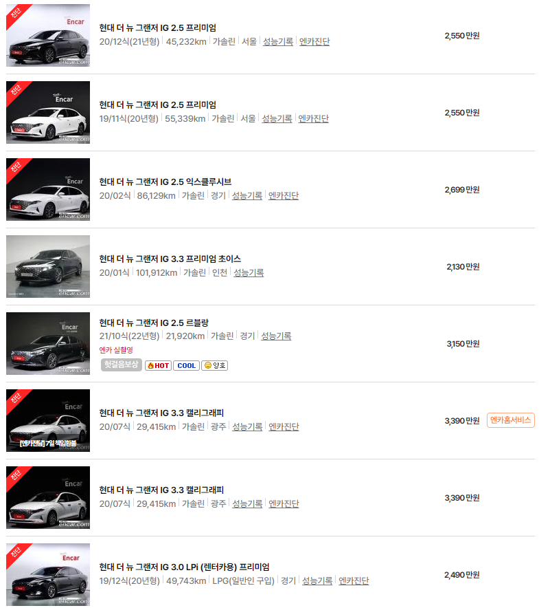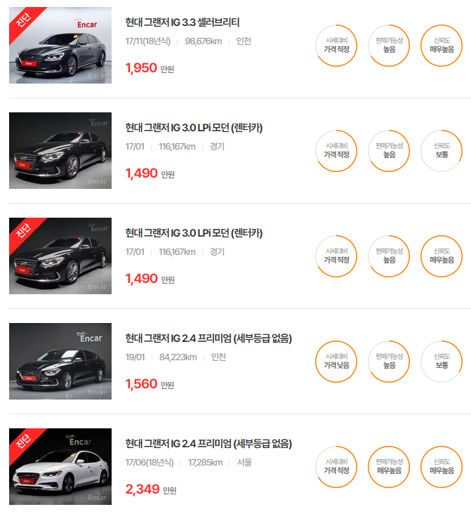 그랜저 IG는 2016년부터 2019년까지 출시된 모델이 인기가 많으며, 주행거리와 옵션에 따라 시세에 차이가 발생합니다.