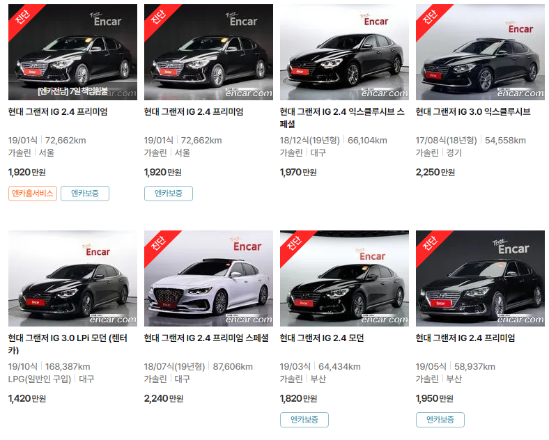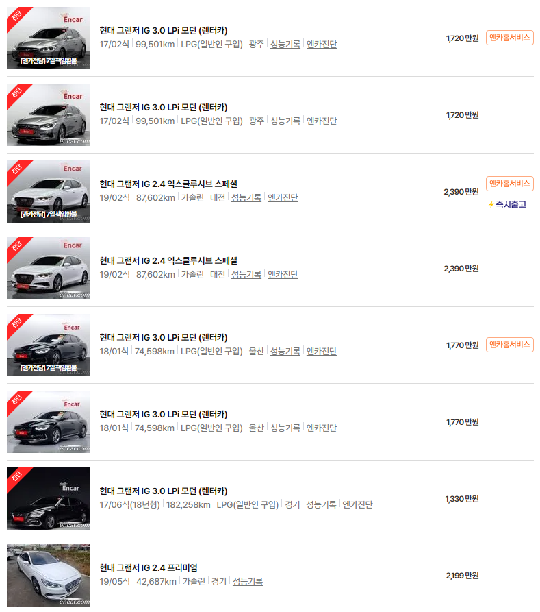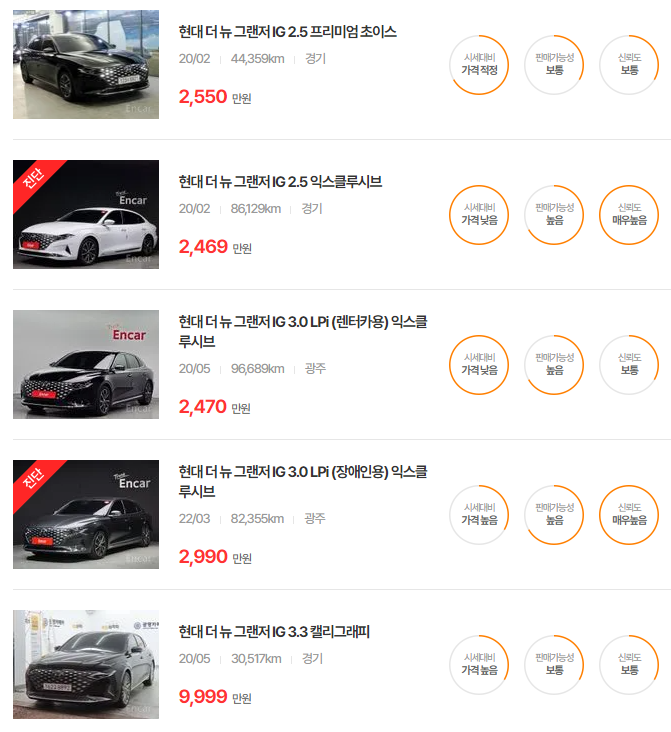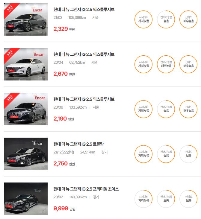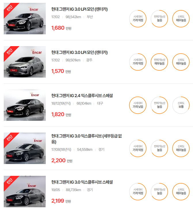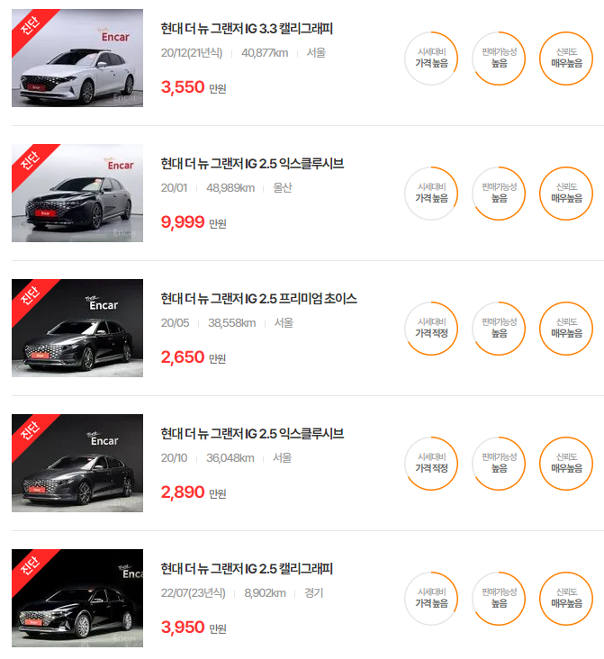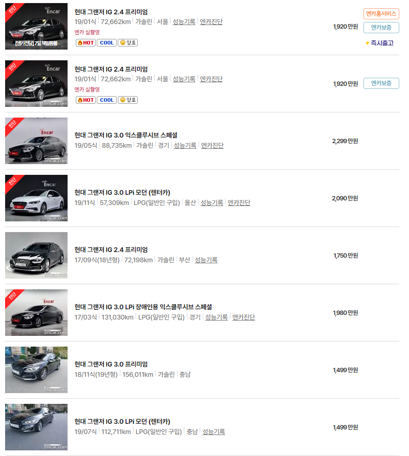 그랜저 IG, HG 중고차 가격