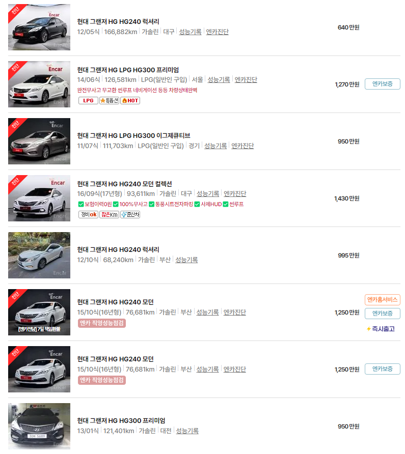 그랜저 IG, HG, 중고차 가격, 연식별 시세, 차량 유지비 등의 정보를 이번 포스팅에서 다루었습니다. 이 글이 그랜저 IG, HG 중고차를 고려하시는 데 도움이 되었길 바랍니다.