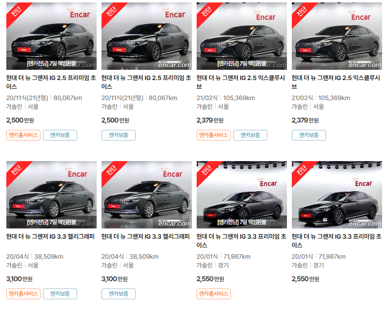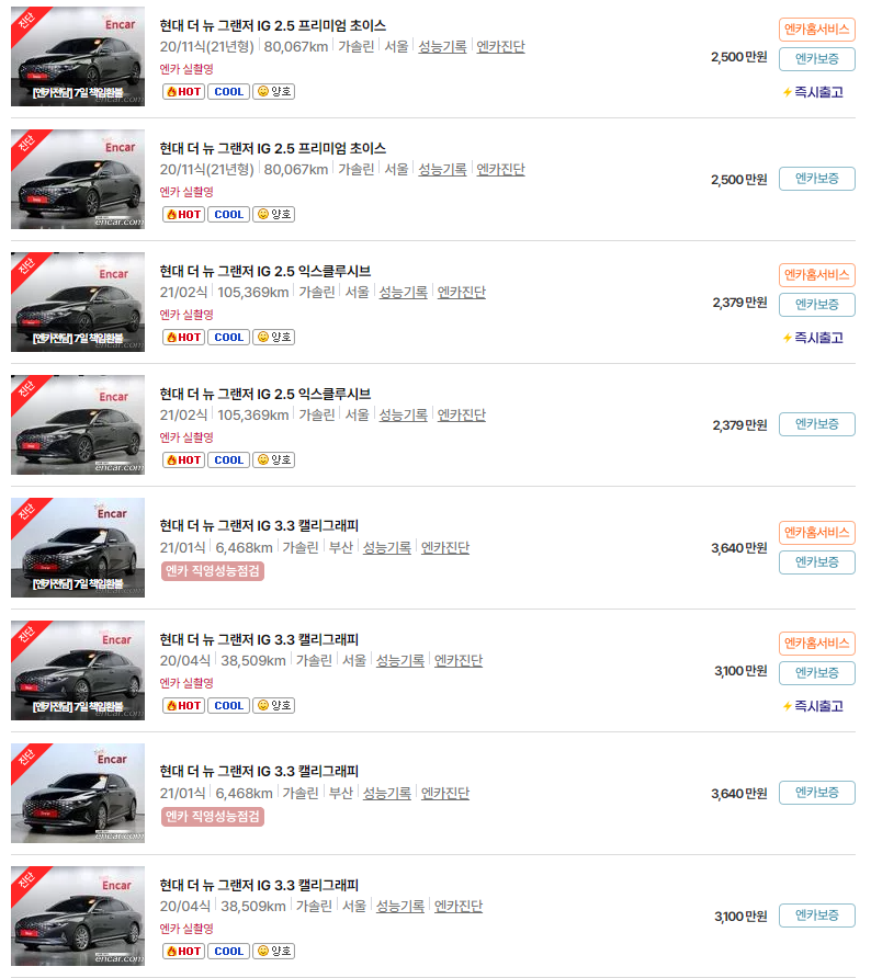 그랜저 IG, HG 중고차 가격
