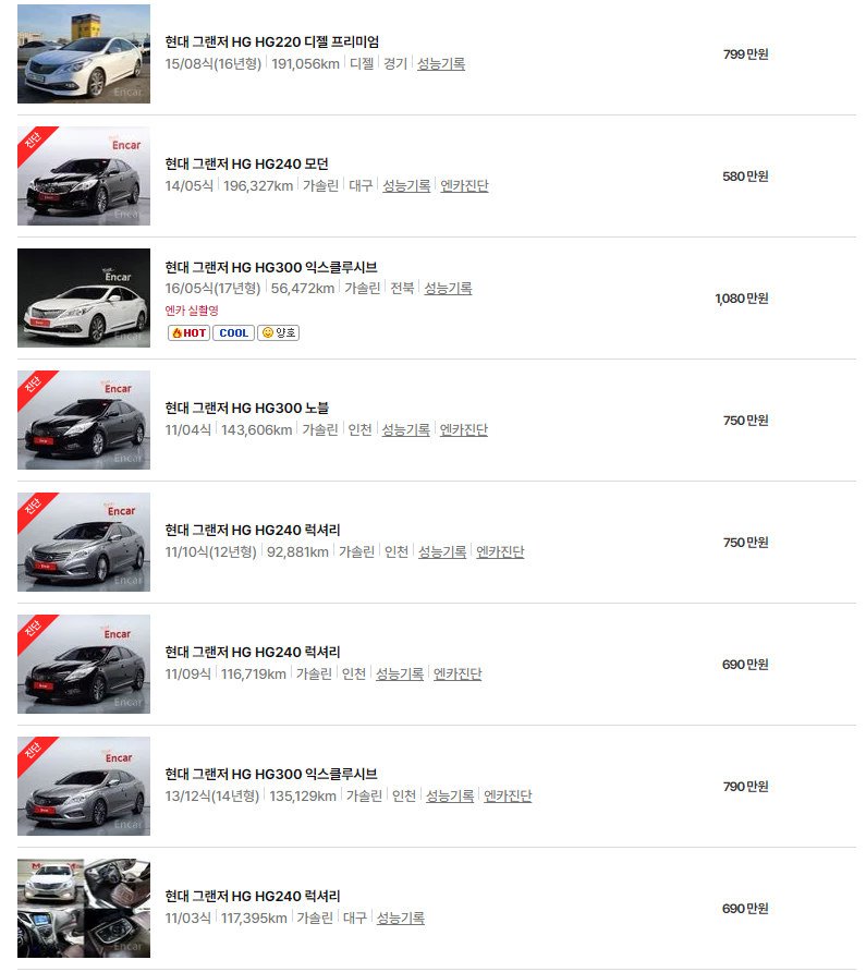 HG 모델은 트림별로도 가격 차이가 크며, 연식이 오래될수록 더 저렴한 가격에 만나볼 수 있습니다. 연식별 옵션과 유지비용까지 함께 비교해보면 더 합리적인 선택이 가능합니다.