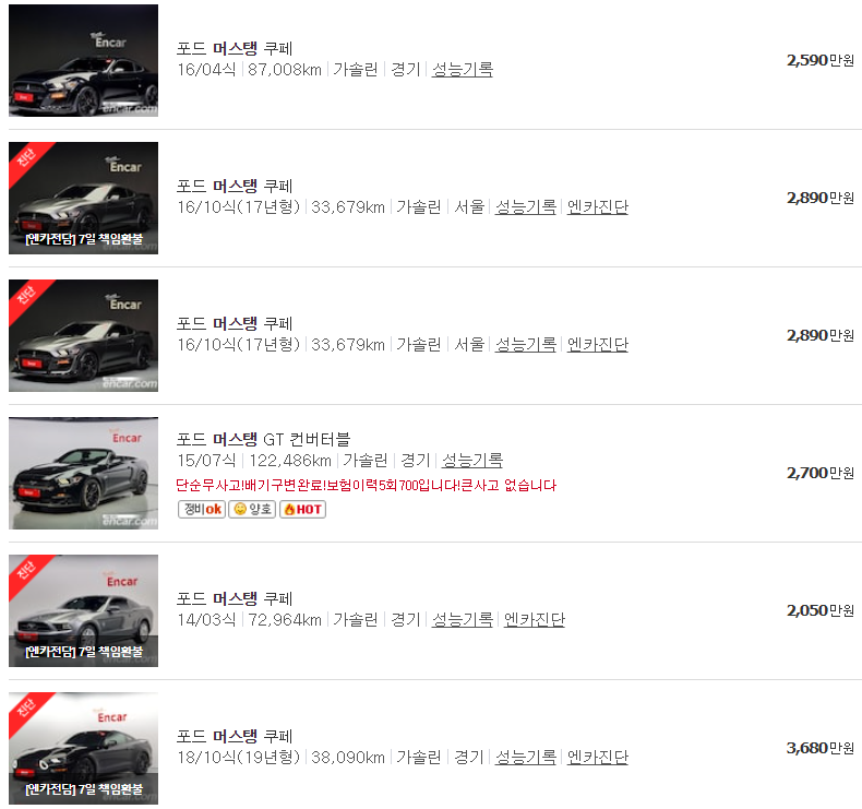 포드 머스텡 중고차 가격 시세표 | 25년 6월 기준