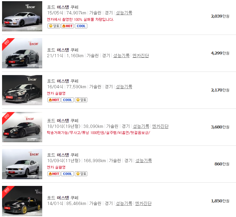 포드 머스텡의 중고차 가격은 연식과 모델에 따라 다양한데, 아래는 2024년 이후의 최신 모델부터 순차적으로 정리하였습니다.