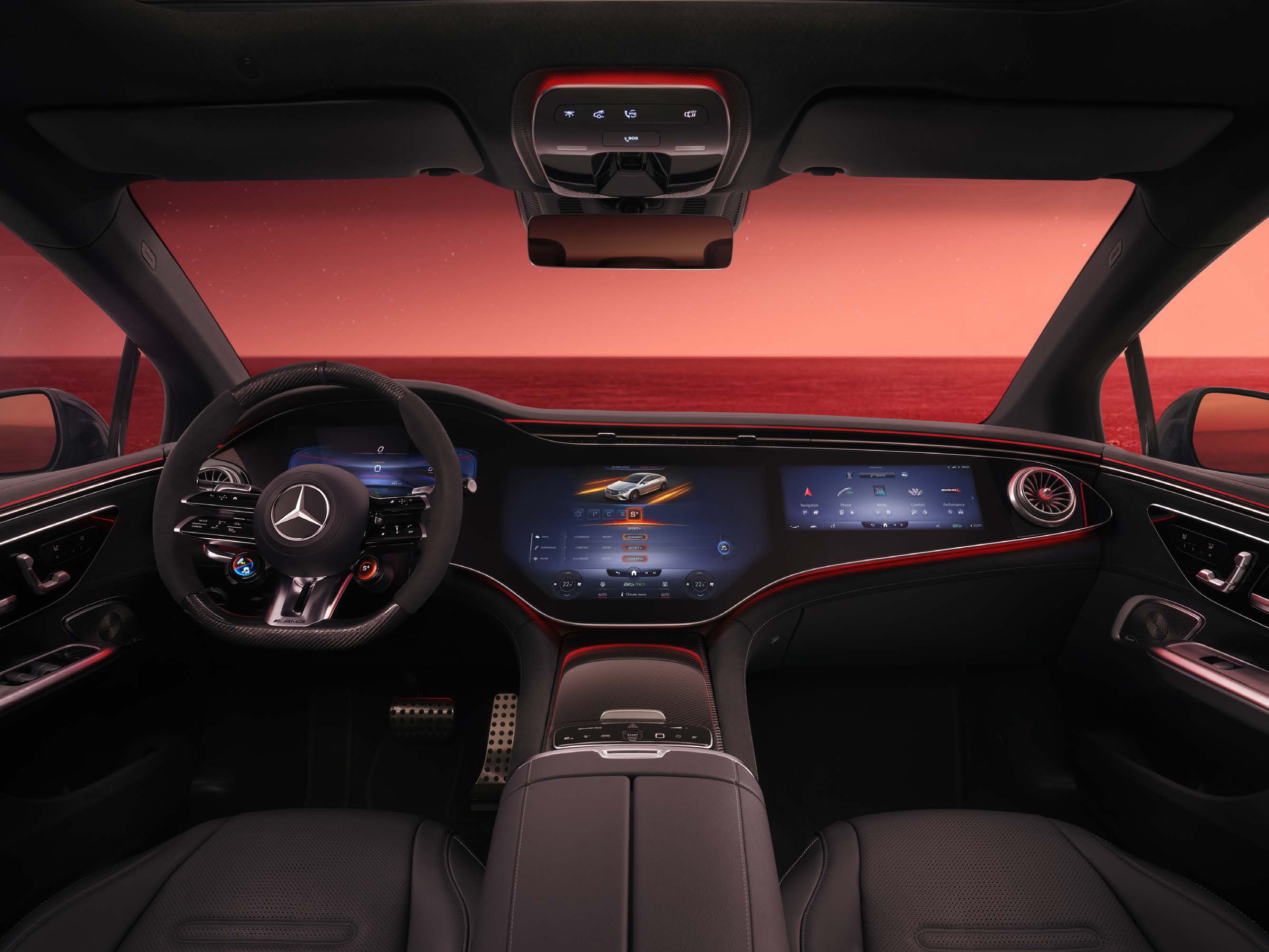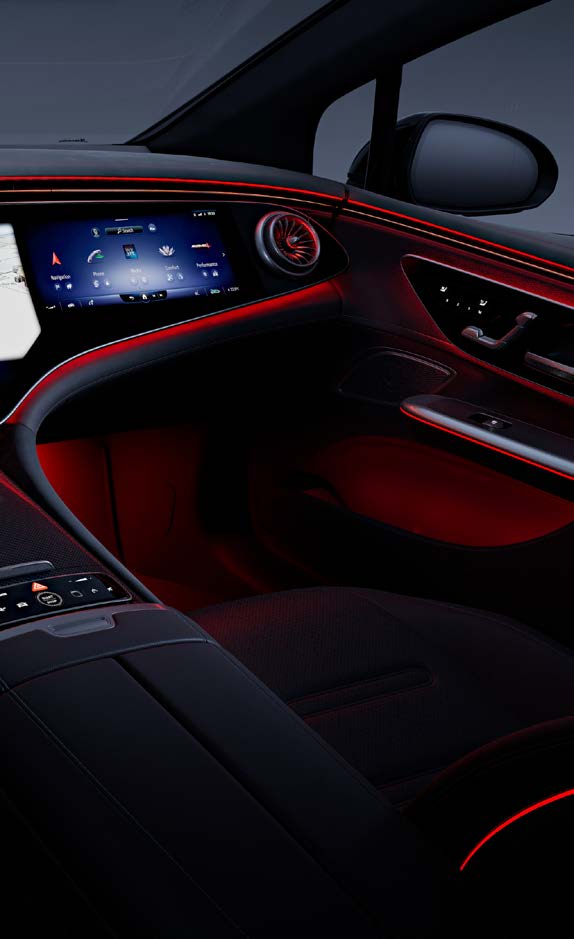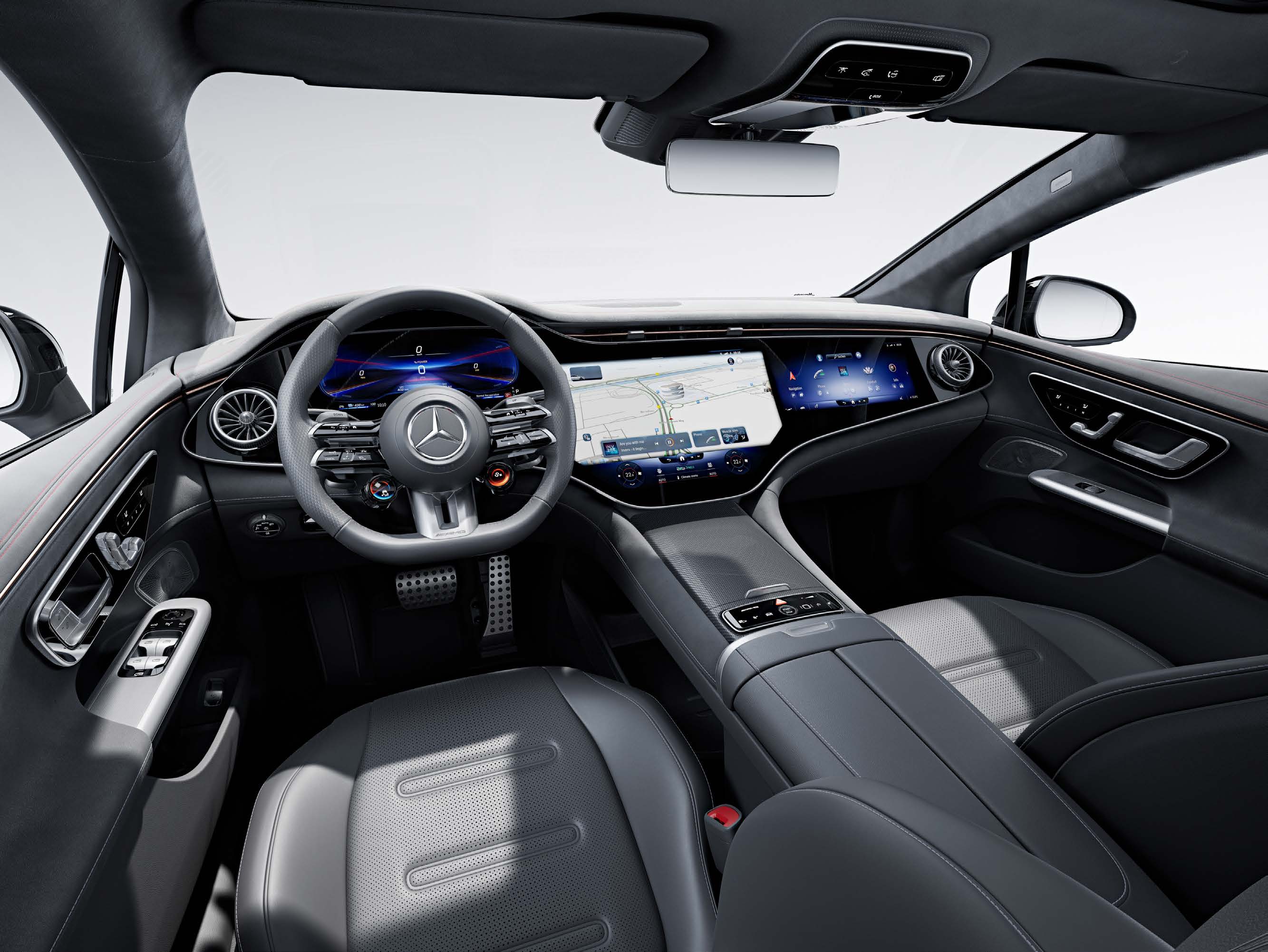 EQE는 가죽 소재의 고급 시트와 맞춤형 조명을 제공하며, 사용자 요구에 맞춰 온도 및 위치 등을 자동으로 조정할 수 있습니다.