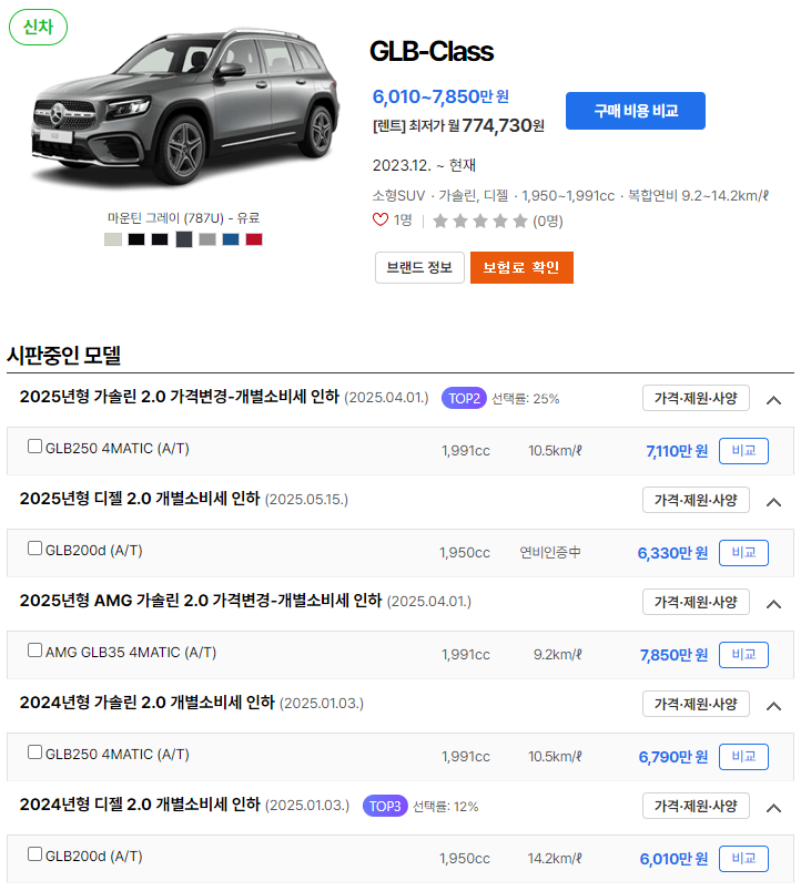 GLB250 4MATIC 트림이 옵션과 가격에서 균형이 잘 맞아 추천됩니다.