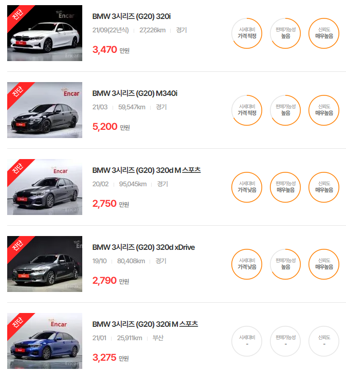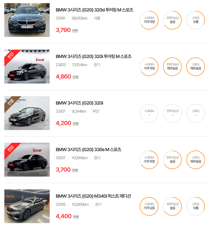 F30 세대는 상대적으로 가격이 낮아 경제적인 선택지로, 특히 트림과 주행거리, 옵션에 따라 가격이 달라질 수 있습니다.